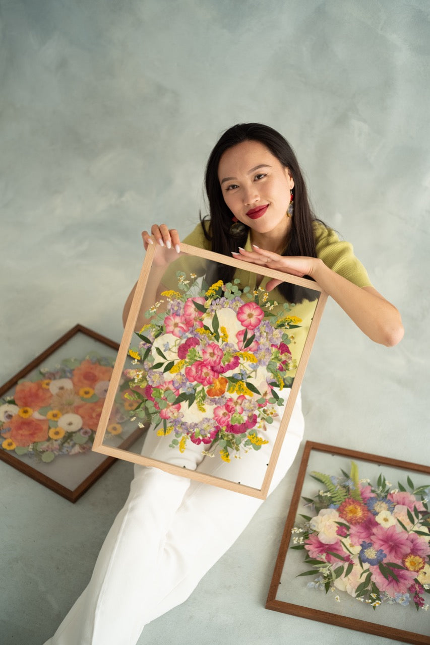 Welcome to PLANTBOX! My name is Jodie and I’m currently based in San Francisco, California. My love for crafts and plants initially led me to dream of running a plant store, but after exploring local shops, I discovered my passion for flowers. I attended flower school, where I learned about the significant waste in the floral industry and became inspired to preserve flowers in a way that makes them last longer. My designs blend art deco and contemporary styles, with a focus on vibrant colors. I’d love to work with you to create a design that holds special meaning and preserves your most cherished memories!